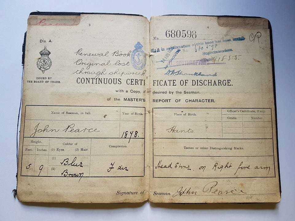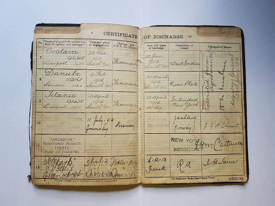 The discharge book belonged to Titanic fireman John Pearce who managed to escape in a lifeboat and survive the sinking.