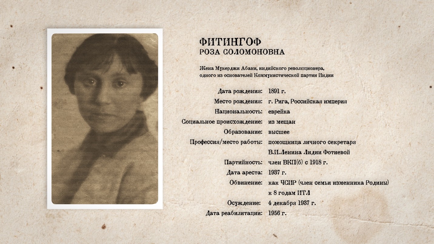 ЛЮБА: И революционер — это наша тётя. Давайте мы начнем с революционера. Наша тётя — Роза Фитингоф. Она была самой старшей из семерых детей. Согласно ее документам, она родилась в 1895 году, но на самом деле она родилась 1891 году. И я думала: почему же в девяносто первом? Потому что ее будущий муж Абани Мукерджи родился тоже в девяносто первом году. Роза, я думаю, была очень независимая, и очень убежденная в своих взглядах на жизнь. Я помню, что она даже поехала из Риги на Бестужевские курсы в Ленинград, тогда это был Санкт-Петербург. После этого она приехала назад в Ригу, а позже поехала учиться в медицинский институт в Тарту, тогда это был город Юрьев, в Эстонии. Потом, получив диплом зубного врача, она решила не возвращаться в Ригу, а ехать в Москву. Там она познакомилась и с очаровательным, обаятельным коммунистом из Индии Абани Мукерджи.