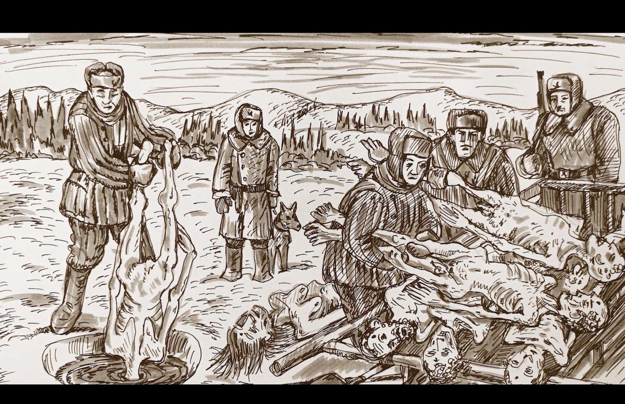 ГЕОРГІЙ ЖЖЕНОВ: У таборі лютували цинга і дизентерія. Неймовірно виснажені або навпаки розпухлі від цинги, уражені фурункульозом люди, жалюгідними купками тулені до стін табірної кухні, заглядали в щілини і гарячковими, запаленими очима божевільних стежили за приготуванням їжі… У промерзлих бараках, на уцілілих «острівцях» нар валялися, щільно притулившись один до одного від холоду, хворі голодні люди. Кожен ранок на нарах залишалося кілька померлих ув’язнених. Їх скорчені, застиглі тіла в примерзлих до узголів’я шапках, стягували з нар, волоком тягнули за зону табору і десь подалі від людських очей закопували до весни в сніг.