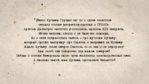 Имени Кузьмы Глущан нет ни в одном известном сегодня списке репрессированных в ГУЛАГе. Архивы Дальстроя частично уничтожены, архивы КГБ закрыты. Исчез человек, словно и не было его никогда. Но в селе сохранилась память — про шутника Кузьму, который пропел частушку про Сталина и загремел на Колыму. Ждали Кузьму после смерти Сталина, но он так и не вернулся. Как погиб, где похоронен, под каким номером? Сейчас в списке Мемориала около трех миллионов восстановленных имен. А сколько таких, как Кузьма, пропавших безвестно?