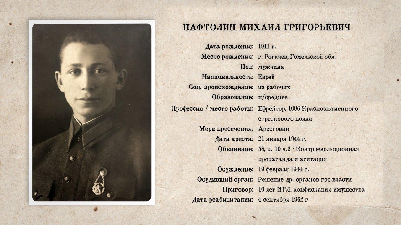 Her father, Mikhail Naftolin, was a frontline soldier, wounded near Bryansk, later captured, and then arrested and sentenced under Article 58.